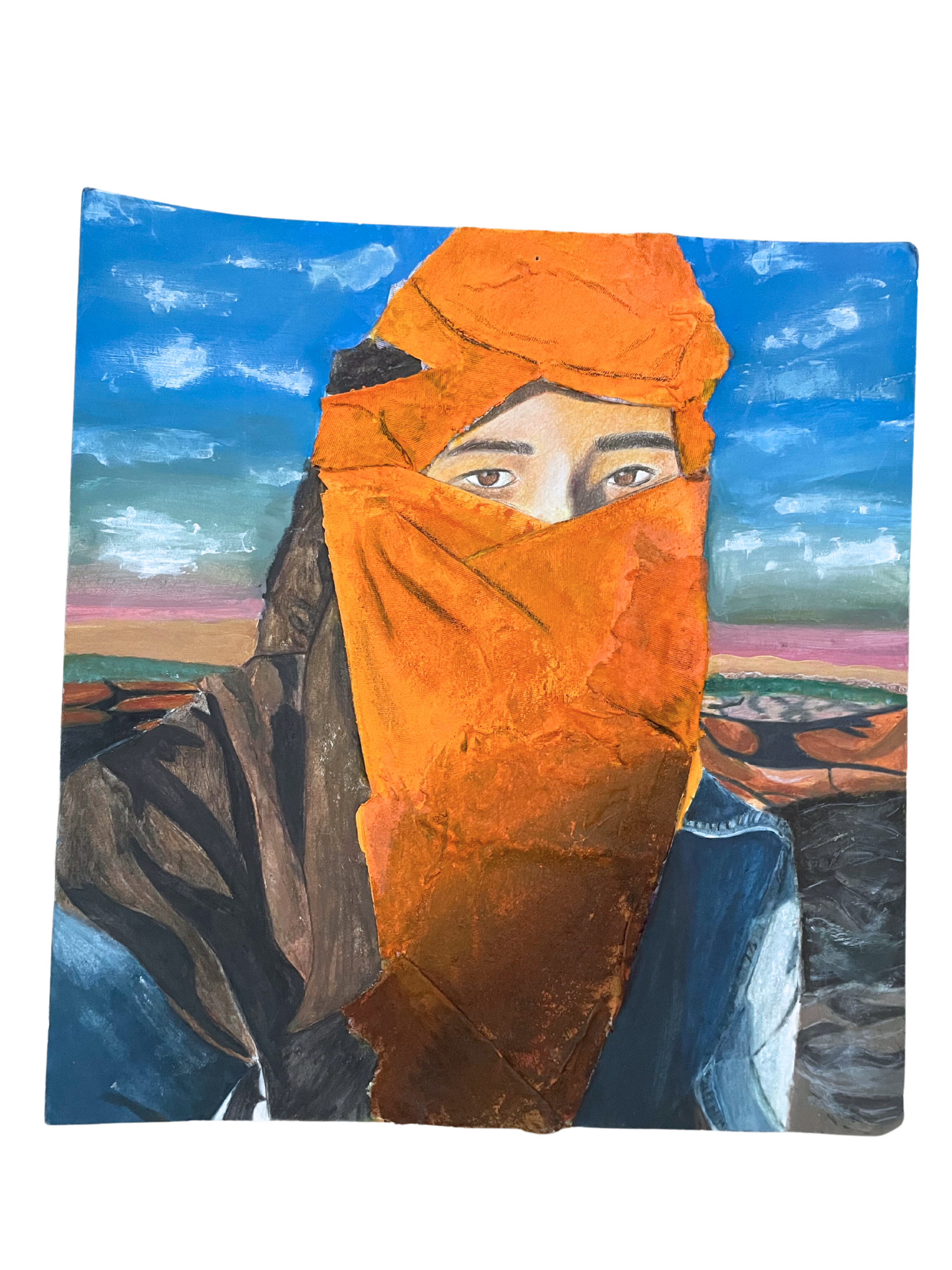 Watercolor, fabric, and acrylic on canvas